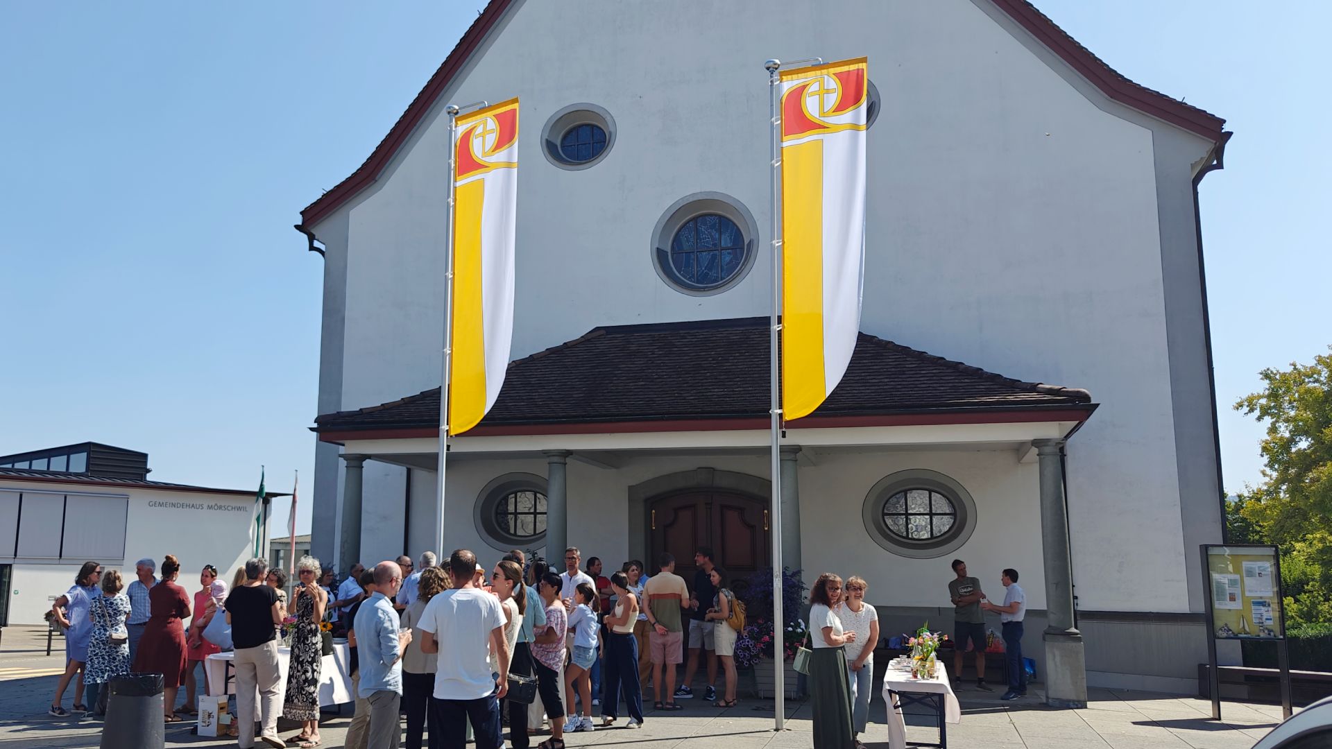 Gegen Ende des Gottesdienstes versammelten wir uns vor der Kirche und hissten gemeinsam die neue Fahne mit Logo der katholischen Kirche und den Farben des Vatikans. Im Anschluss lud der Pfarreirat herzlich zu einem Apéro und gesellschaftlichem Zusammensein ein.